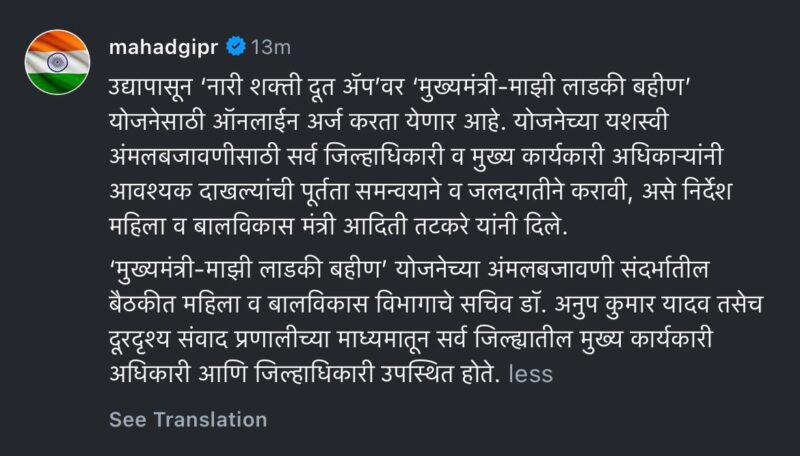 मुख्यमंत्री – माझी लाडकी बहीण योजनेअंतर्गत नारीशक्ती दूत या मोबाईल अॅपवरुन ज्यांनी स्वतःचे वा अन्य लाभार्थीचे अर्ज केले असतील अशा सर्व १. महिला २. समूह संसाधन व्यक्ती ३. बचत गट अध्यक्ष ४. बचतगट सचिव ५. गृहिणी ६. अंगणवाडी सेविका/मदतनीस ७. ग्रामसेवक ८. वॉर्ड अधिकारी ९. सेतू १०. बालवाडी सेविका ११. आशा सेविका १२. पर्यवेक्षिका (मुख्यसेविका) १३. CMM2 १४. मदतकक्ष प्रमुख यांना आवाहन करण्यात येते की, नारीशक्ती दूत अॅप मधील आपल्या प्रोफाईलला लॉगीन करुन यापूर्वी केलेले अर्ज या टॅगवर क्लिक करुन आपल्याद्वारे सबमिट केलेले संपूर्ण अर्जाची यादी पाहू शकता. त्यामुळे Aprroved, Disapproved, Pending, Rejected असे शेरे आणि लाभार्थीचे नाव, मोबाईल नंबर सुद्धा पाहता येतील.